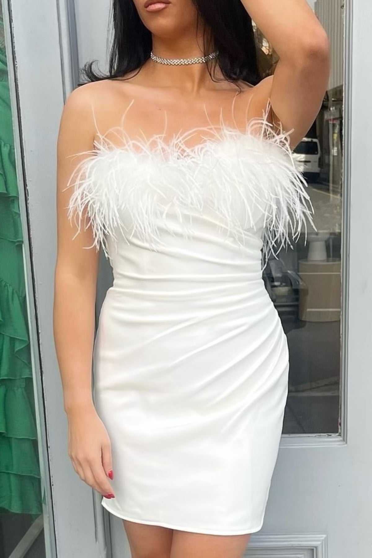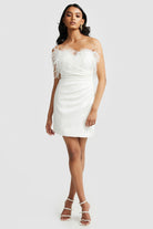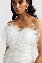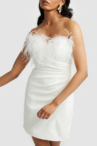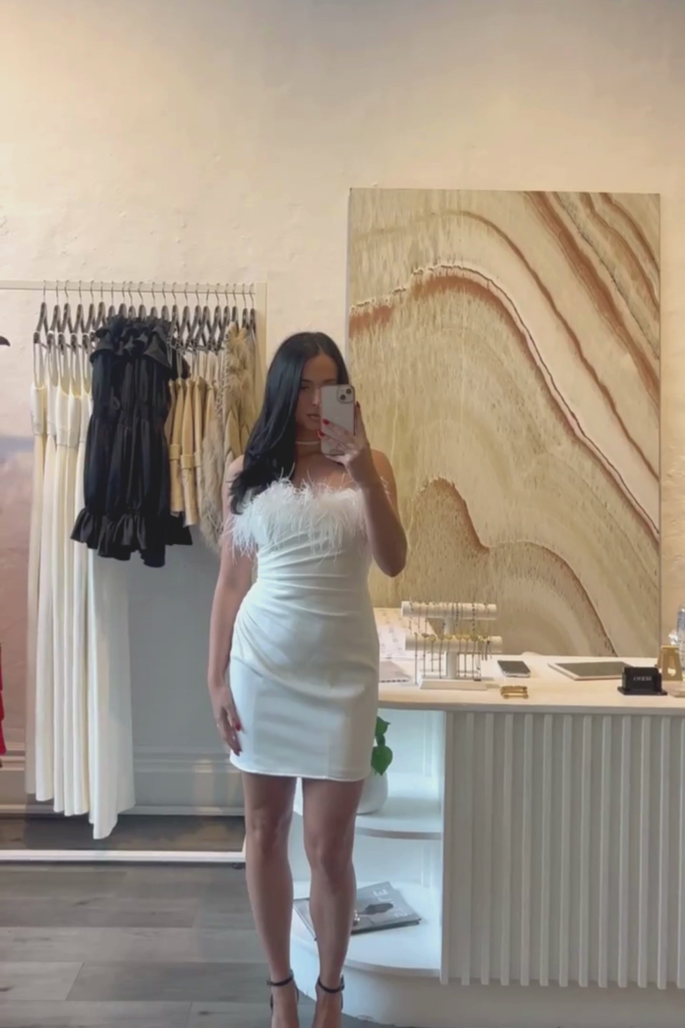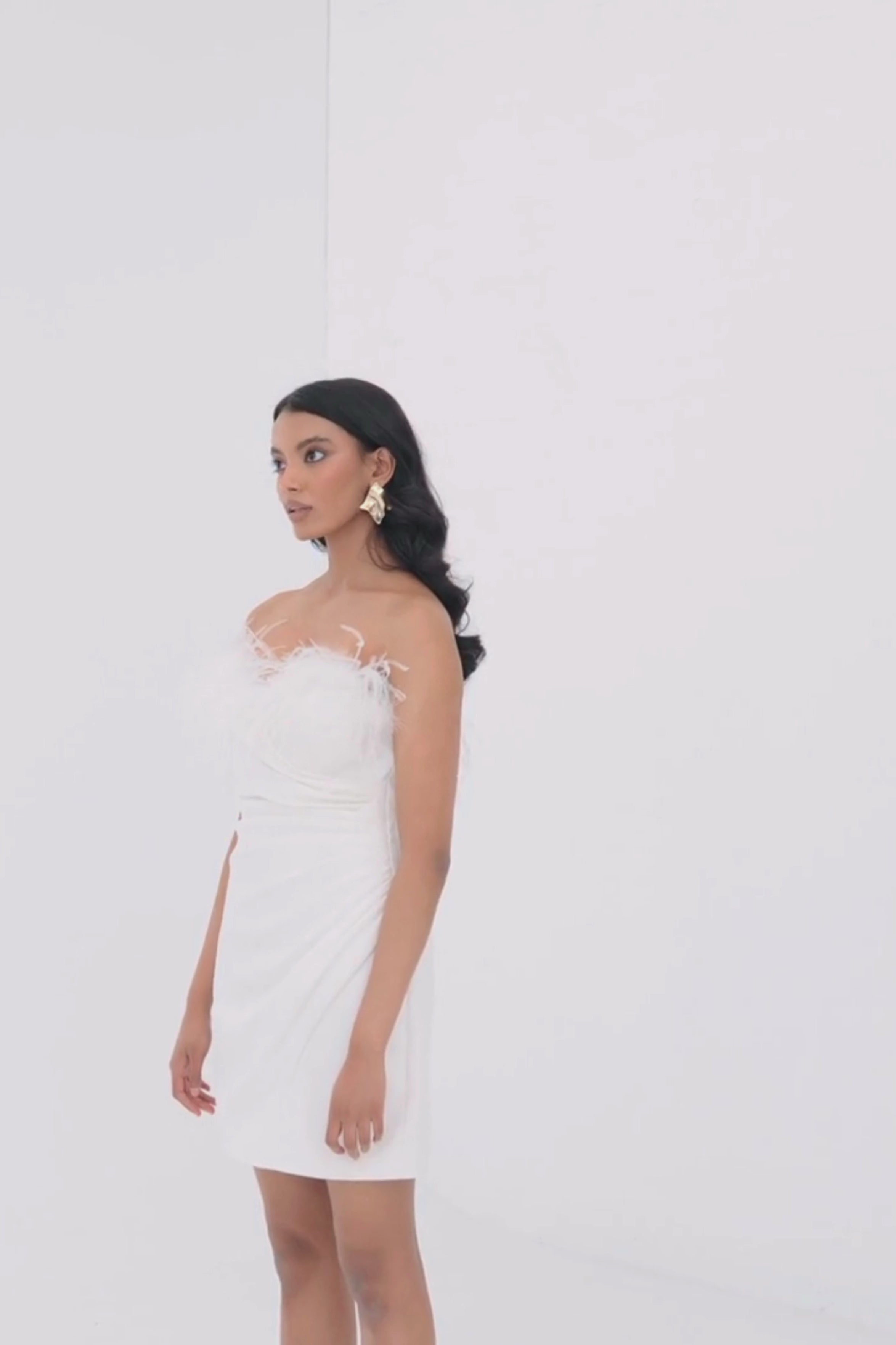 The Milano Mini Dress is a classic silhouette that effortlessly displays grace and elegance. This timeless number incorporates a straight cut with in-built bra cups and ostrich feather trim neckline. Curated by our well-equipped artisans, the dress has been carefully shaped with flattering tucks at the side waist and mini length for a sense of sultry to the classic design. Available in Black and White.