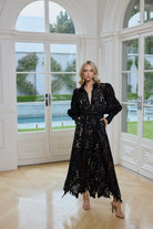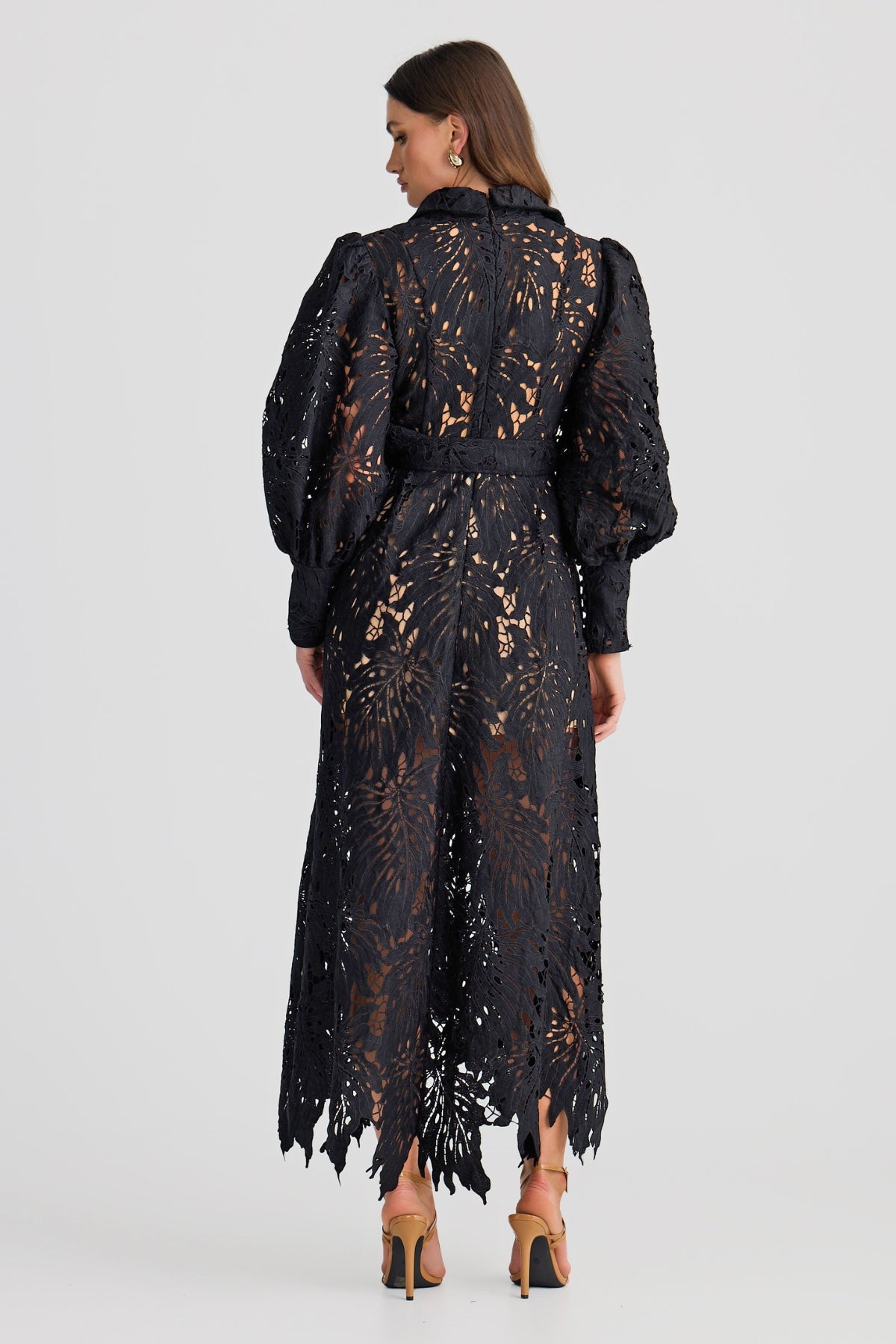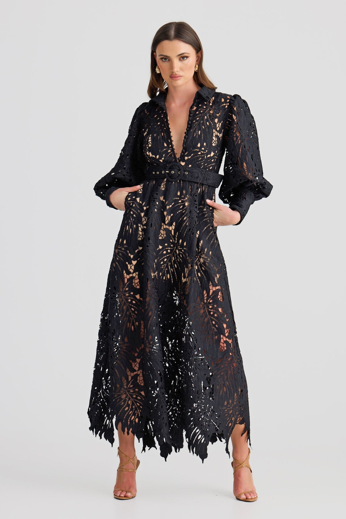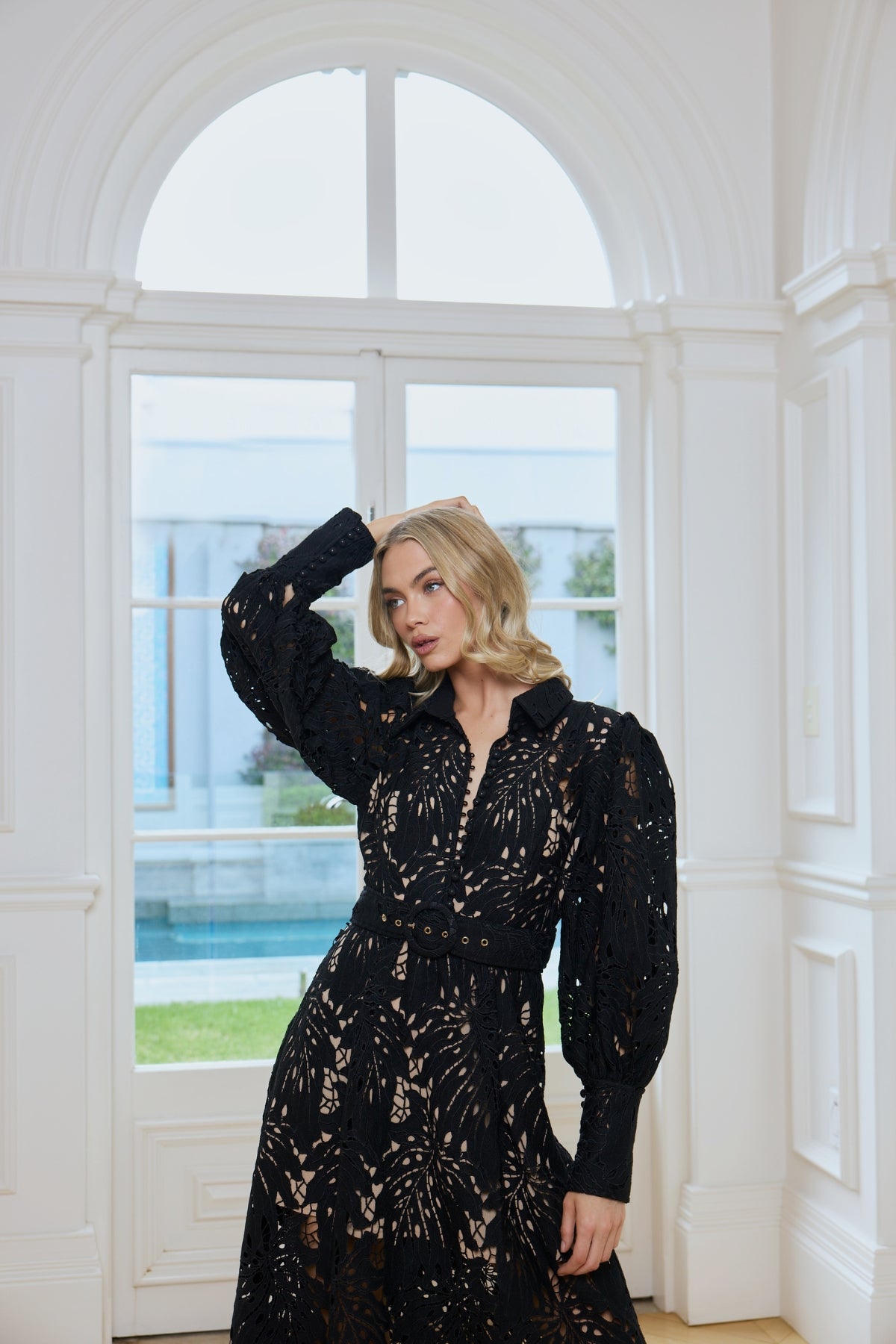 This exquisite lace dress exudes elegance and refinement. Featuring intricate palm leaf lace detailing, it boasts V-neckline, voluminous long sleeves, a figure-enhancing belted waist and uniquely detailed scalloped hem. The silhouette and dome buttons along the neckline and cuffs adds a timeless appeal, making it perfect for day to night dress that will be sure to make you feel a world of opulence.