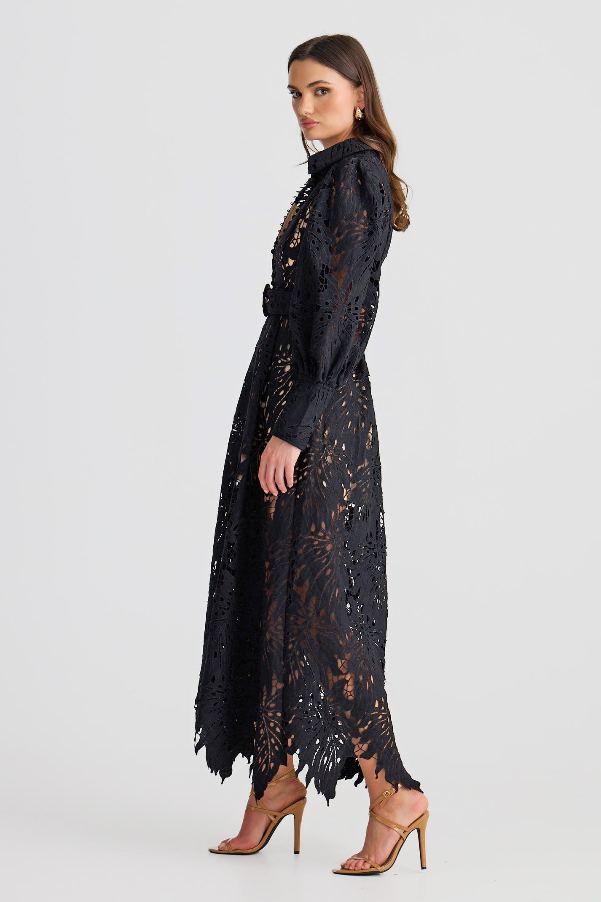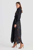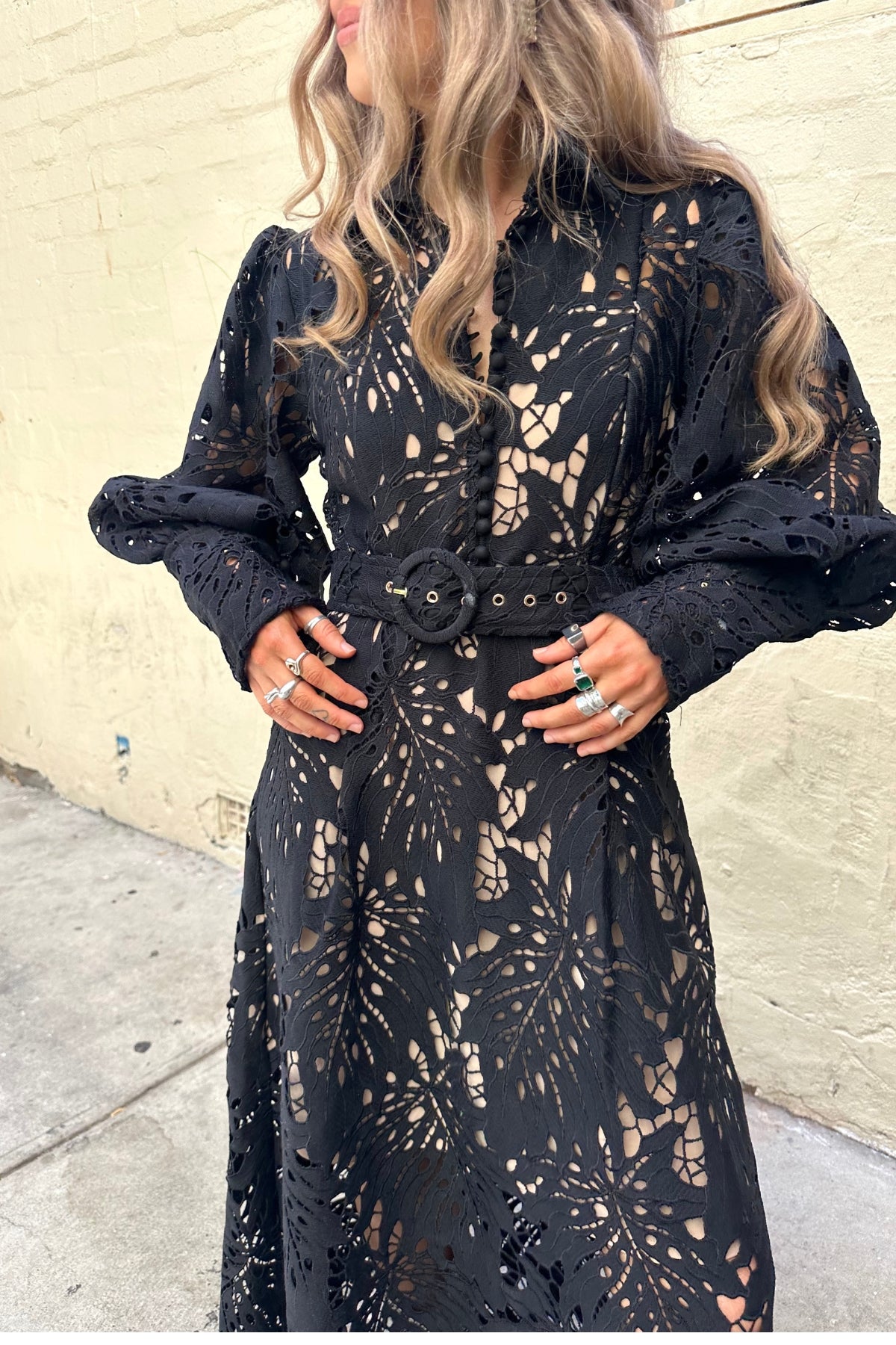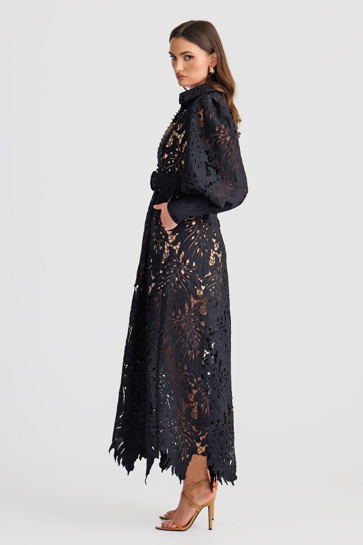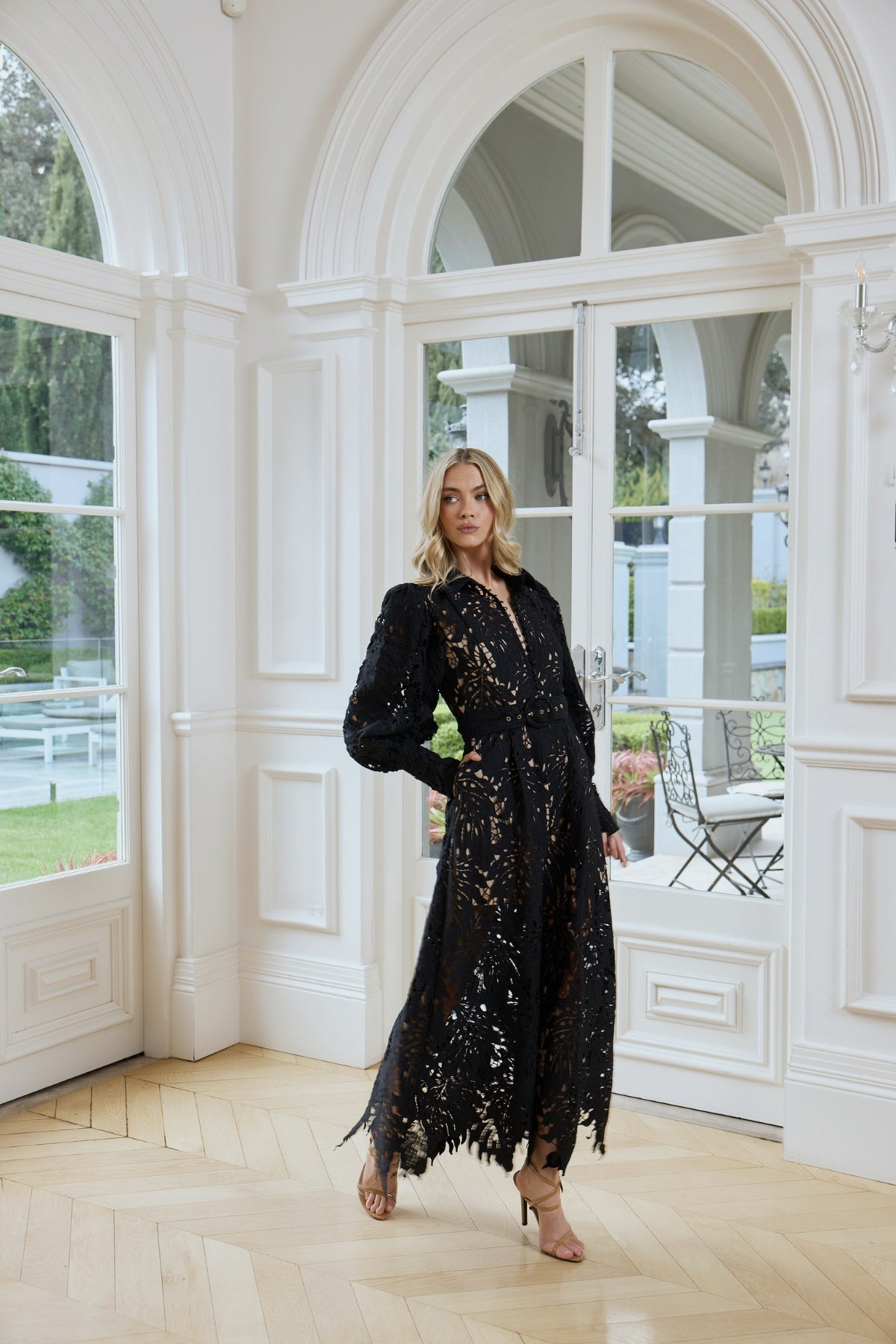 This exquisite lace dress exudes elegance and refinement. Featuring intricate palm leaf lace detailing, it boasts V-neckline, voluminous long sleeves, a figure-enhancing belted waist and uniquely detailed scalloped hem. The silhouette and dome buttons along the neckline and cuffs adds a timeless appeal, making it perfect for day to night dress that will be sure to make you feel a world of opulence.