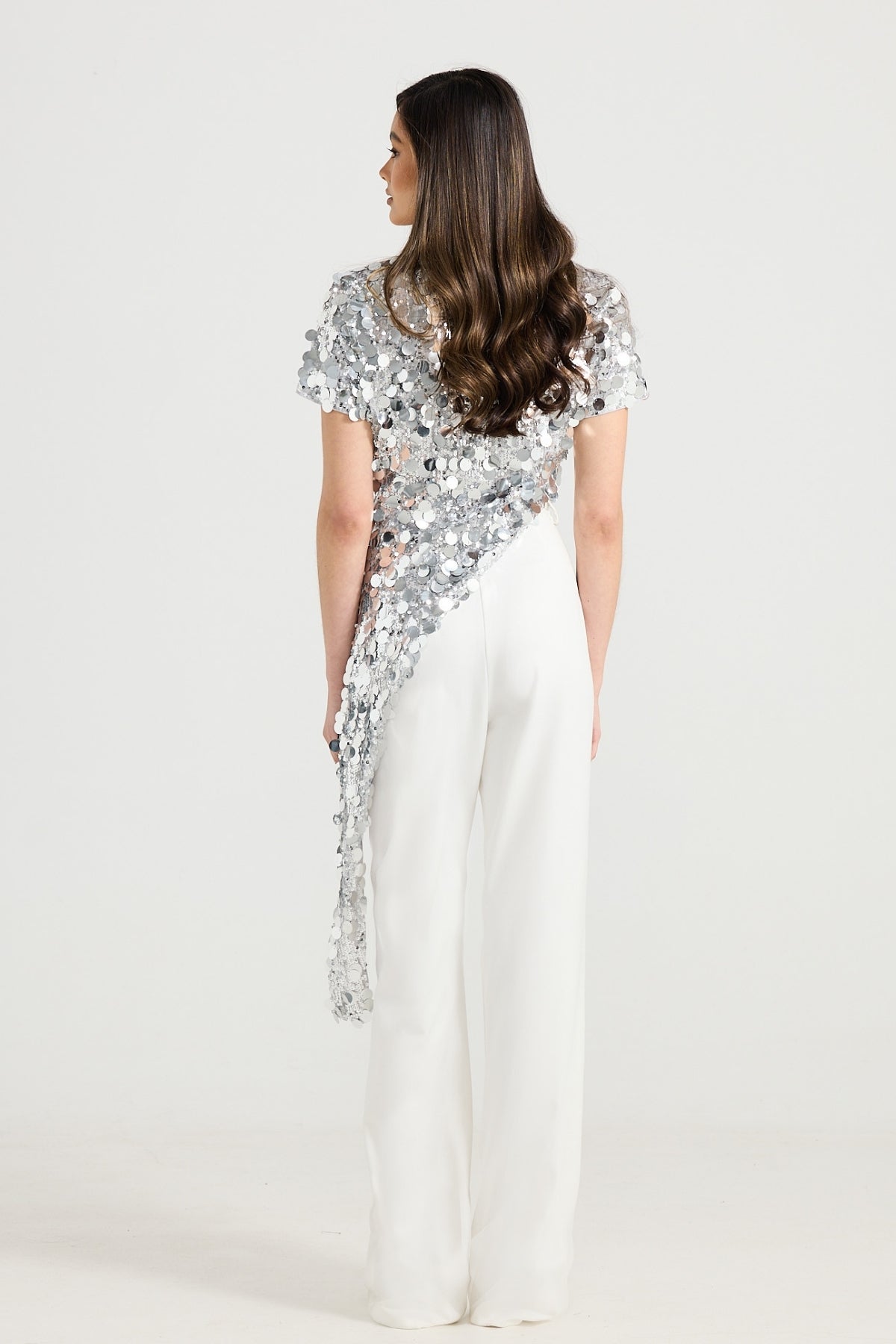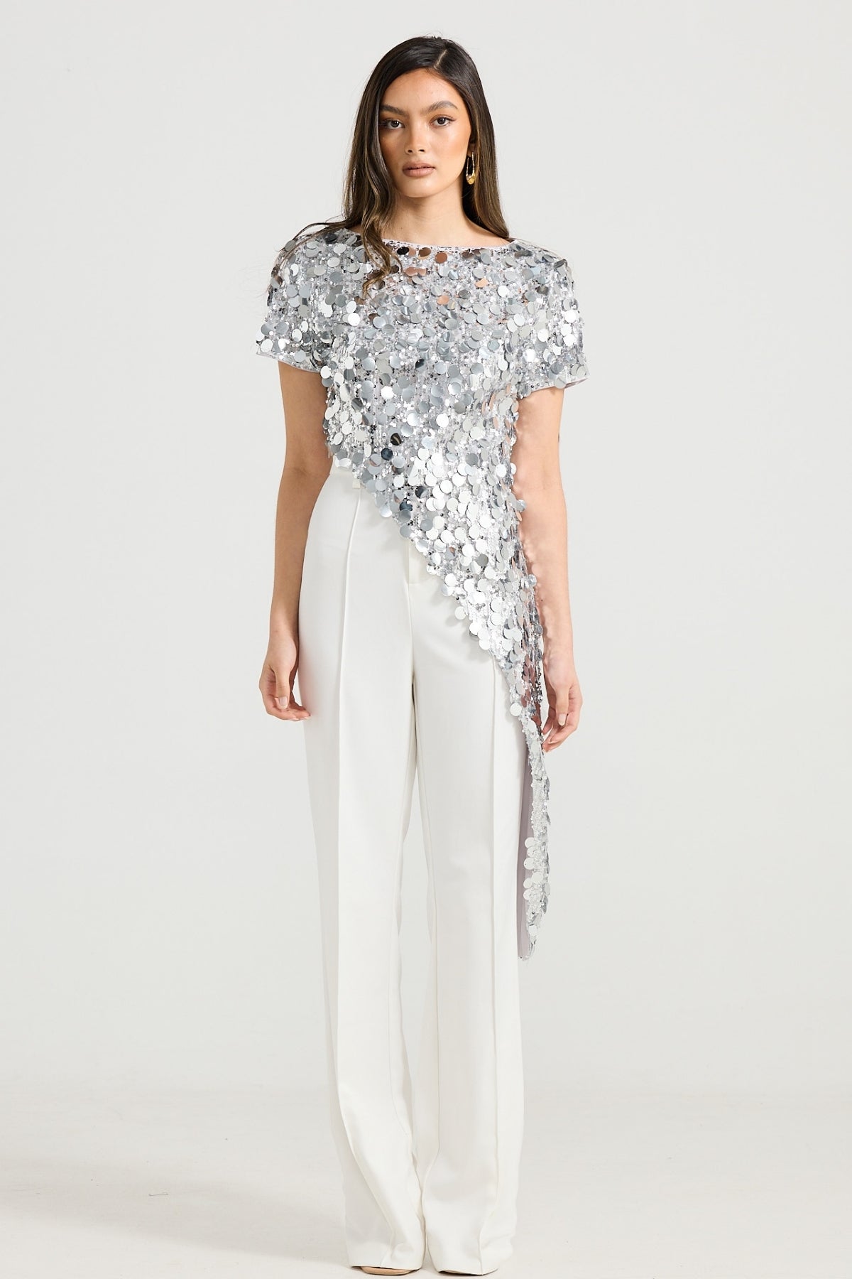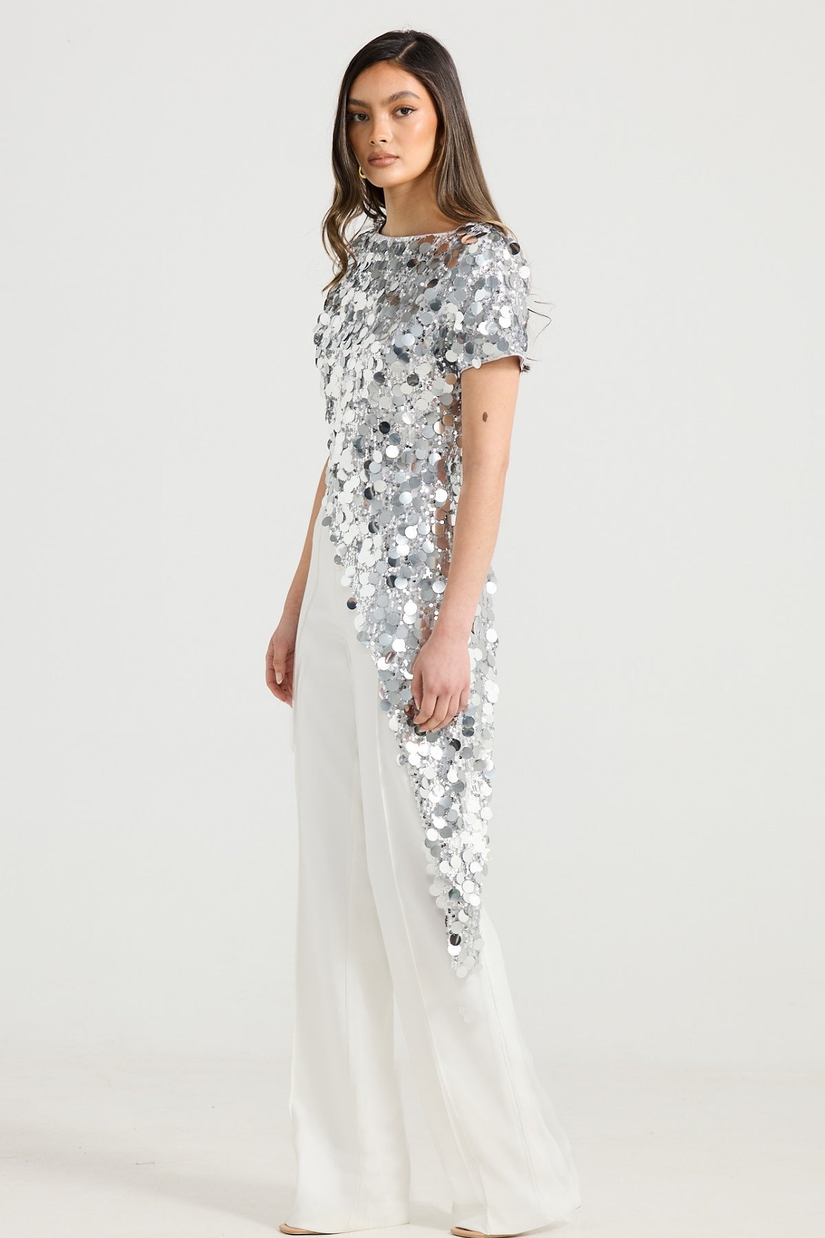 Elevate your wardrobe with the Venus top. The mirrored sequin top is designed to bring a touch of glamour and sophistication to any outfit. Featuring a boat neckline and an eye-catching asymmetrical hem, this top is perfect for making a stylish statement whilst being comfortable. Available in silver and black.