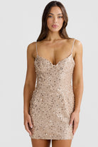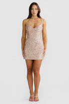 Steal the spotlight with the Jacinta Mini in Rose Gold. This party dress is a masterpiece of elegance and glamour, featuring a form fitting silhouette adorned with all-over shimmering sequins. The adjustable straps and sweet-heart neckline exude sophistication, while luxurious pearl and sequin fabrication ensures you'll shine at any event. Enjoy celebrating life's special moments in the mini designed to make you feel confident and radiant. Available in Ivory and Rose Gold.