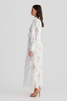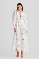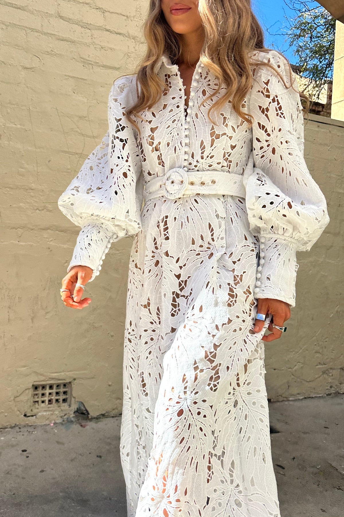 This exquisite lace dress exudes elegance and refinement. Featuring intricate palm leaf lace detailing, it boasts V-neckline, voluminous long sleeves, a figure-enhancing belted waist and uniquely detailed scalloped hem. The silhouette and dome buttons along the neckline and cuffs adds a timeless appeal, making it perfect for day to night dress that will be sure to make you feel a world of opulence.
