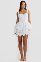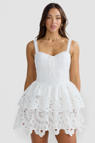 The Valeria Mini Dress is a playful addition to your summer wardrobe. The mini dress features two-tier scallop hem A-line silhouette, snatched corset waisted bodice, wide sat straps with a delicate embroidery trim. Ideal for everything from garden parties, your next holiday to evening outings; this dress pairs perfectly with heels or stylish flats.