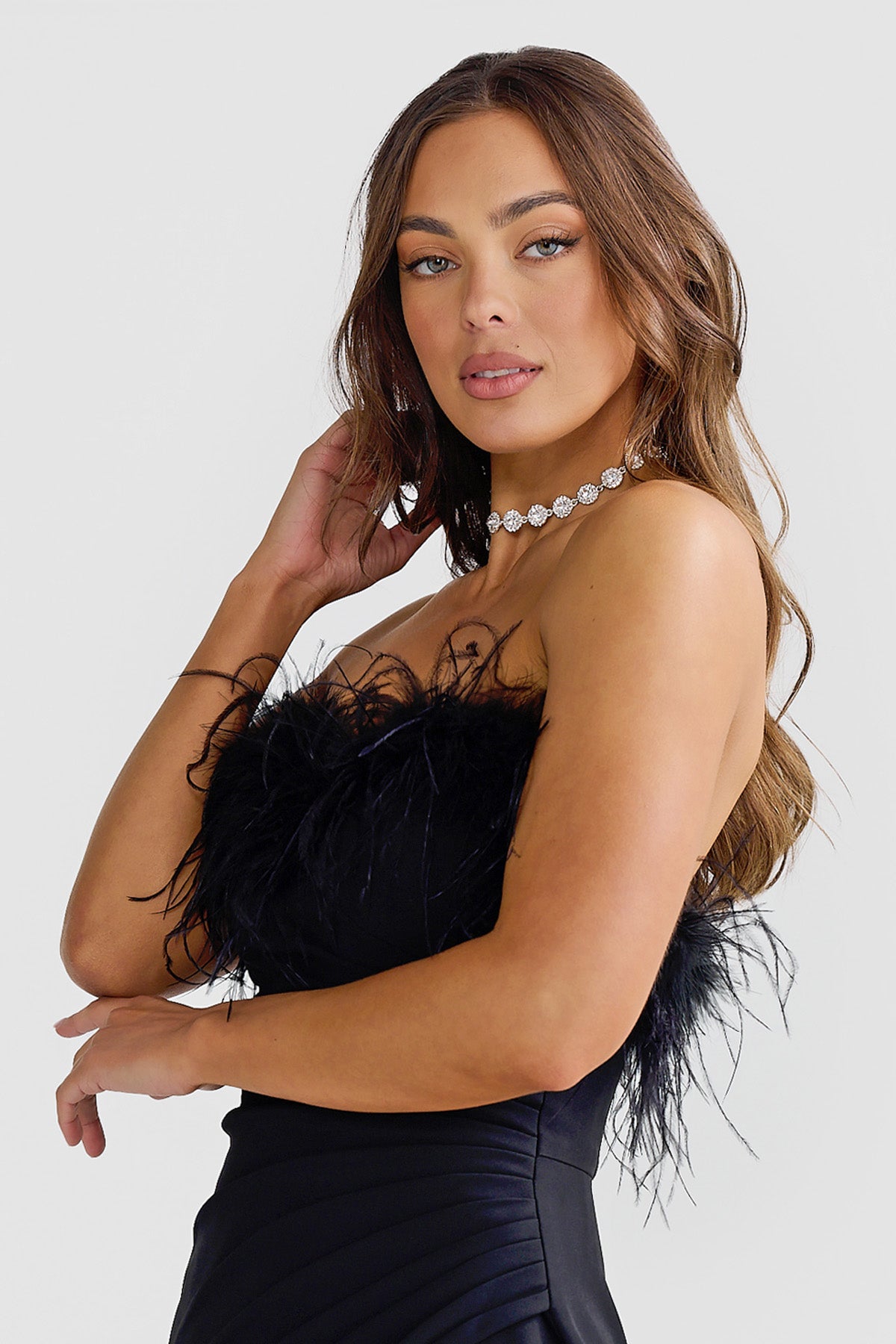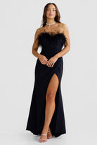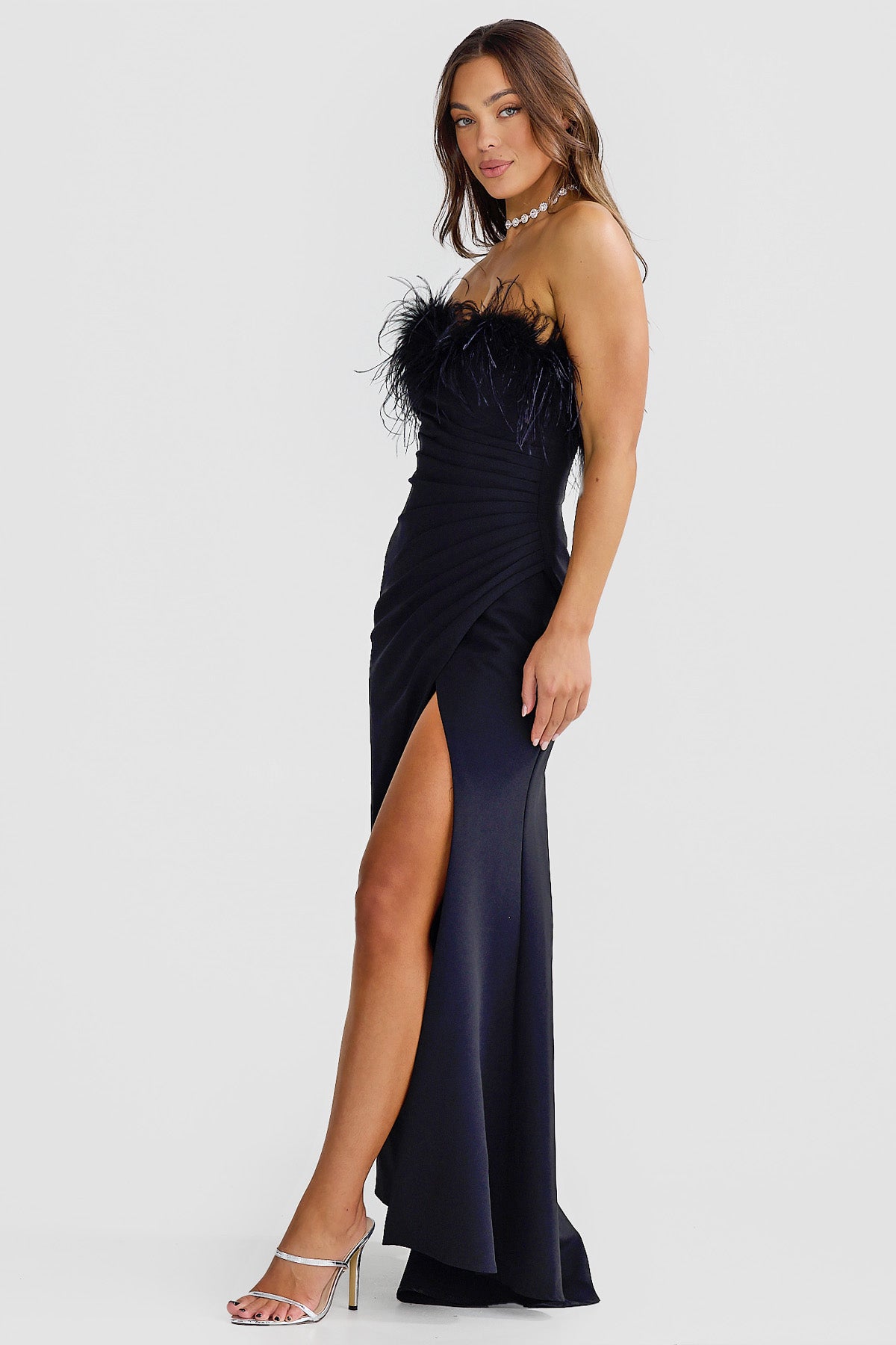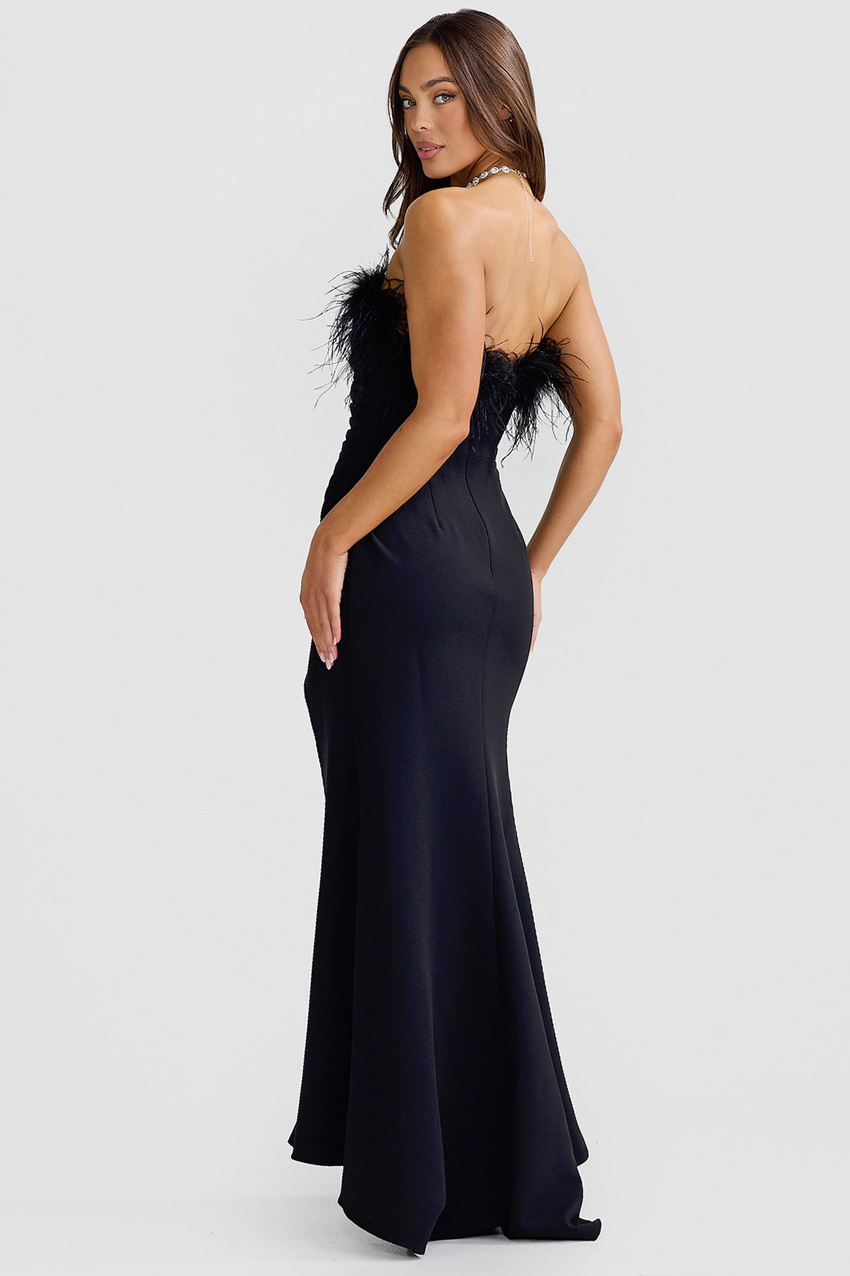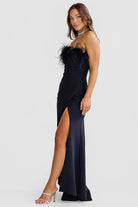 The Milano Gown is a classic silhouette that effortlessly displays grace and elegance. This timeless number incorporates a mermaid silhouette with in-built bra cups and ostrich feather trim neckline. Curated by our well-equipped artisans, the dress has been carefully shaped with flattering tucks at the side waist and a leg split for a sense of sultry to the classic design. Available in Black, Red and White.