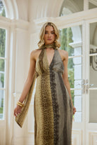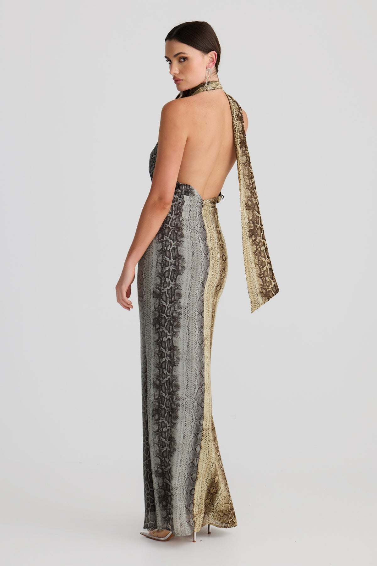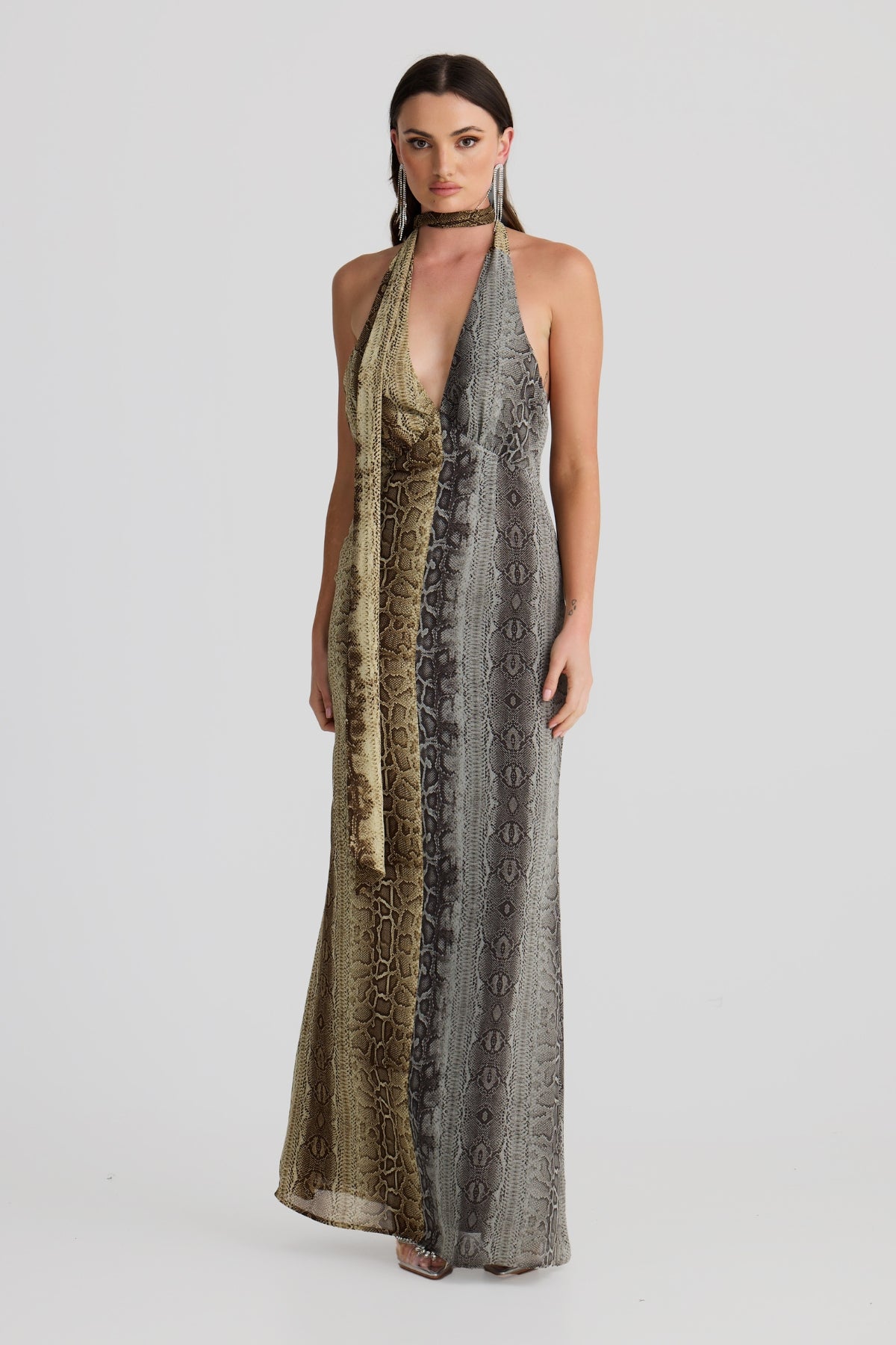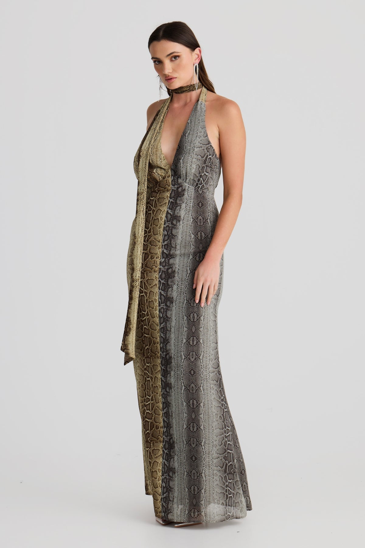 Make a bold statement with the snakeskin Saskia Halter Dress. Featuring an adjustable wrap-around neck tie to suit all shapes. Saskia embraces the edge of a unique contrast effect, on different tonal shades of the print. Dress her up with stilettos and earrings for the evening, or layer with outerwear for the cooler days.